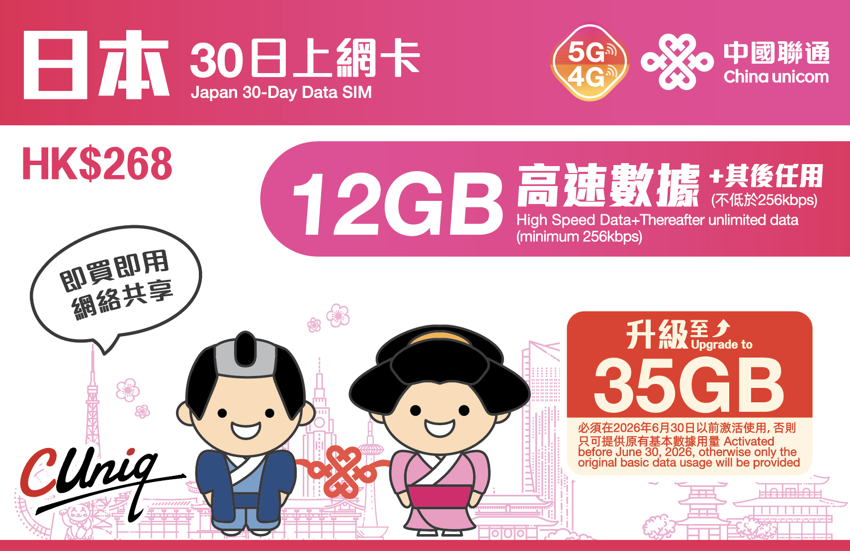 日本30日上网卡(35GB)(必须在2026年6月30日以前激活使用, 否则只可提供原有基本数据用量15GB)