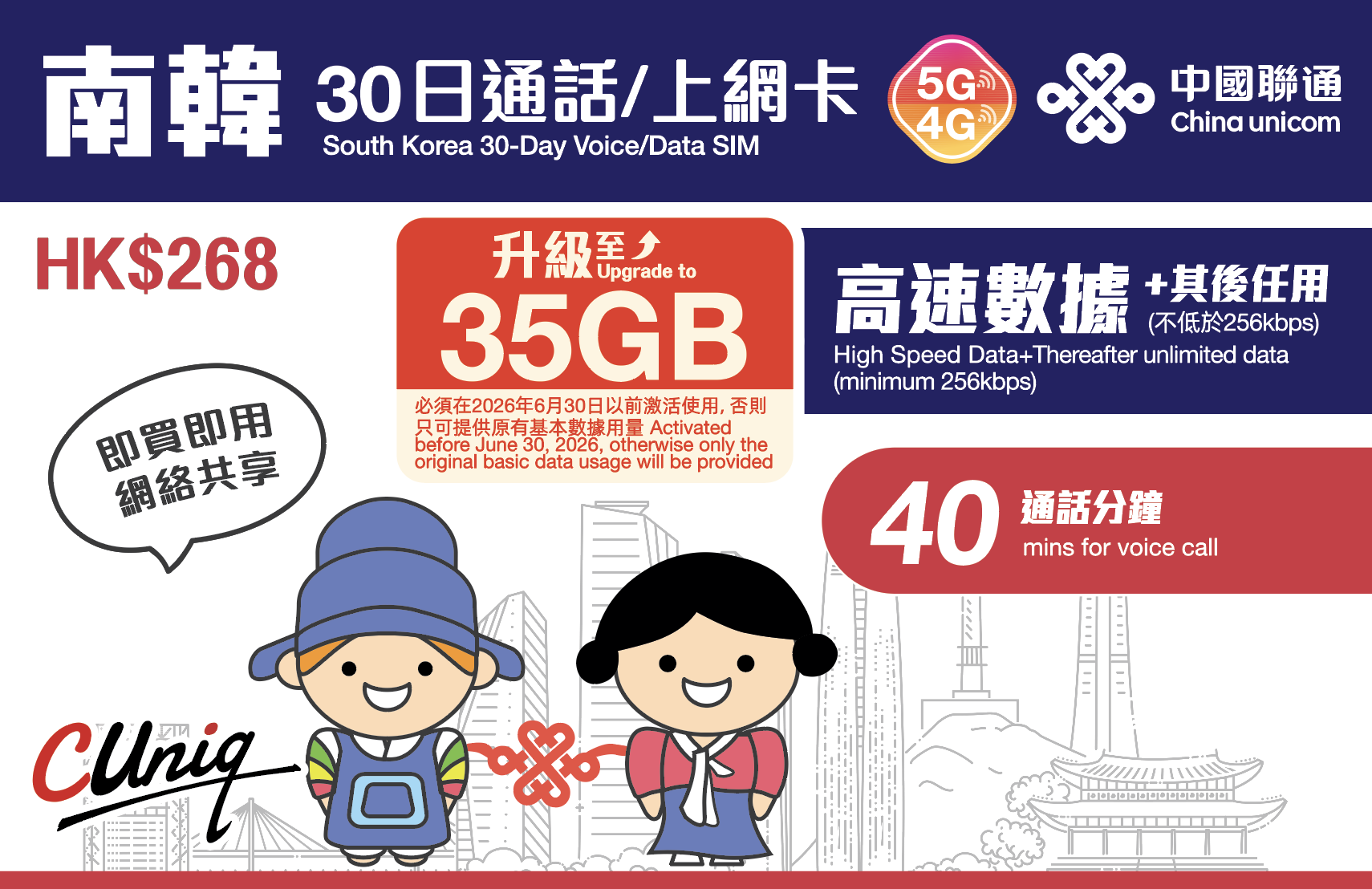 南韩30日通话/上网卡(35GB)(必须在2026年6月30日以前激活使用, 否则只可提供原有基本数据用量30GB)